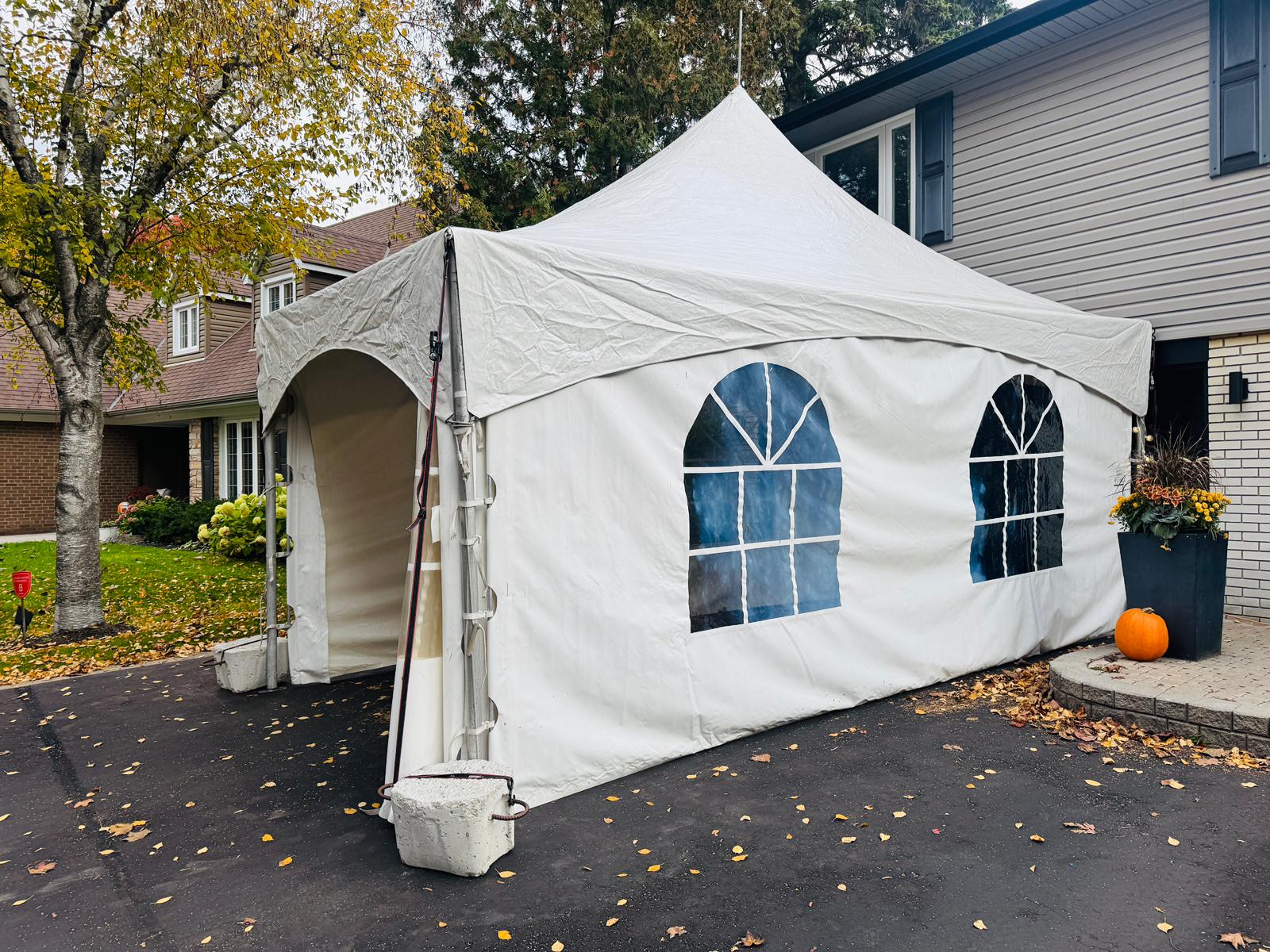 A high-peak marquee tent providing an elegant, all-weather event space for a private party at a Mirada Place residence in Mississauga