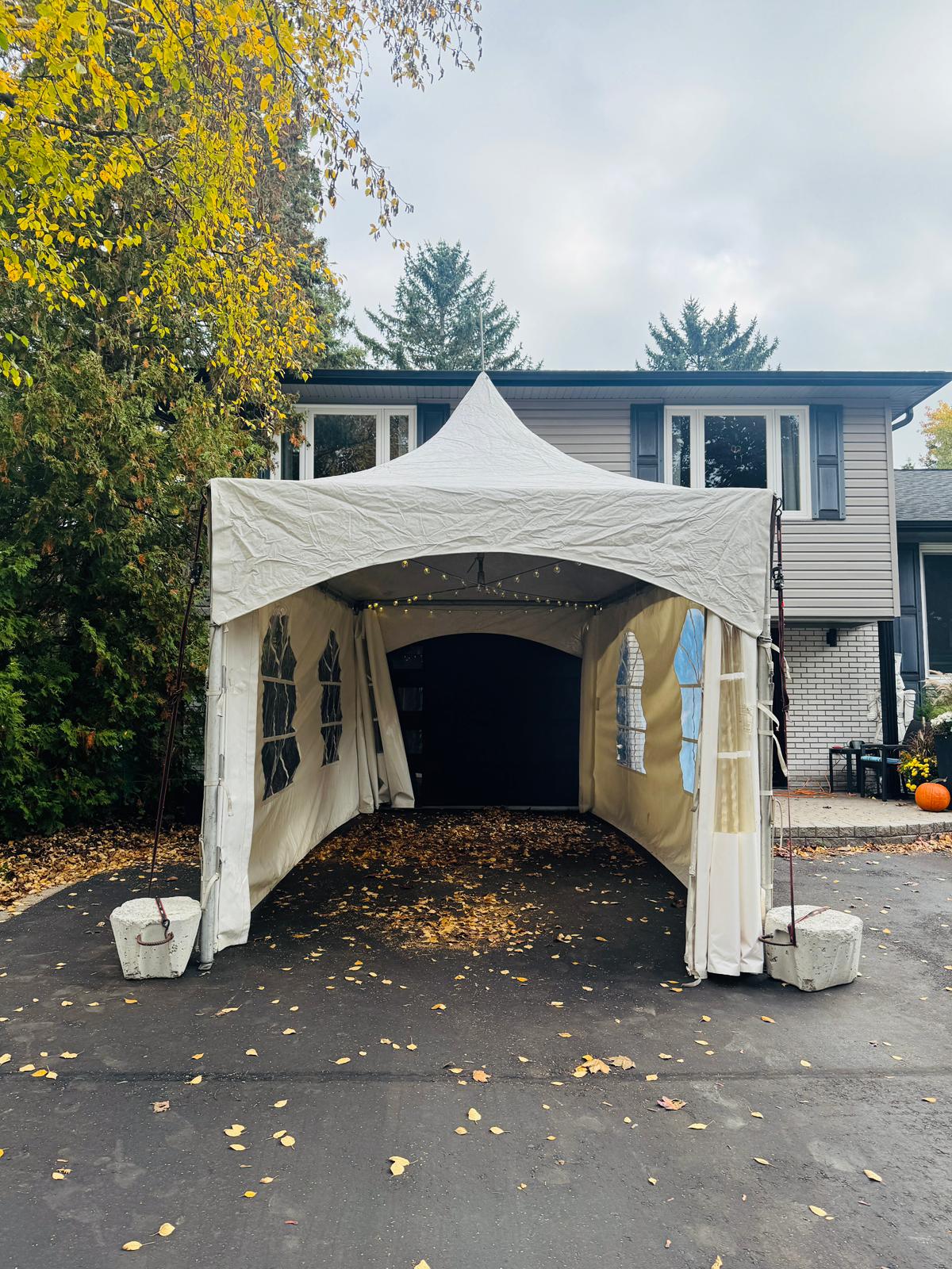 The inviting, well-lit entrance to an autumn tent party in Mississauga, with bistro string lights creating a warm ambiance 1