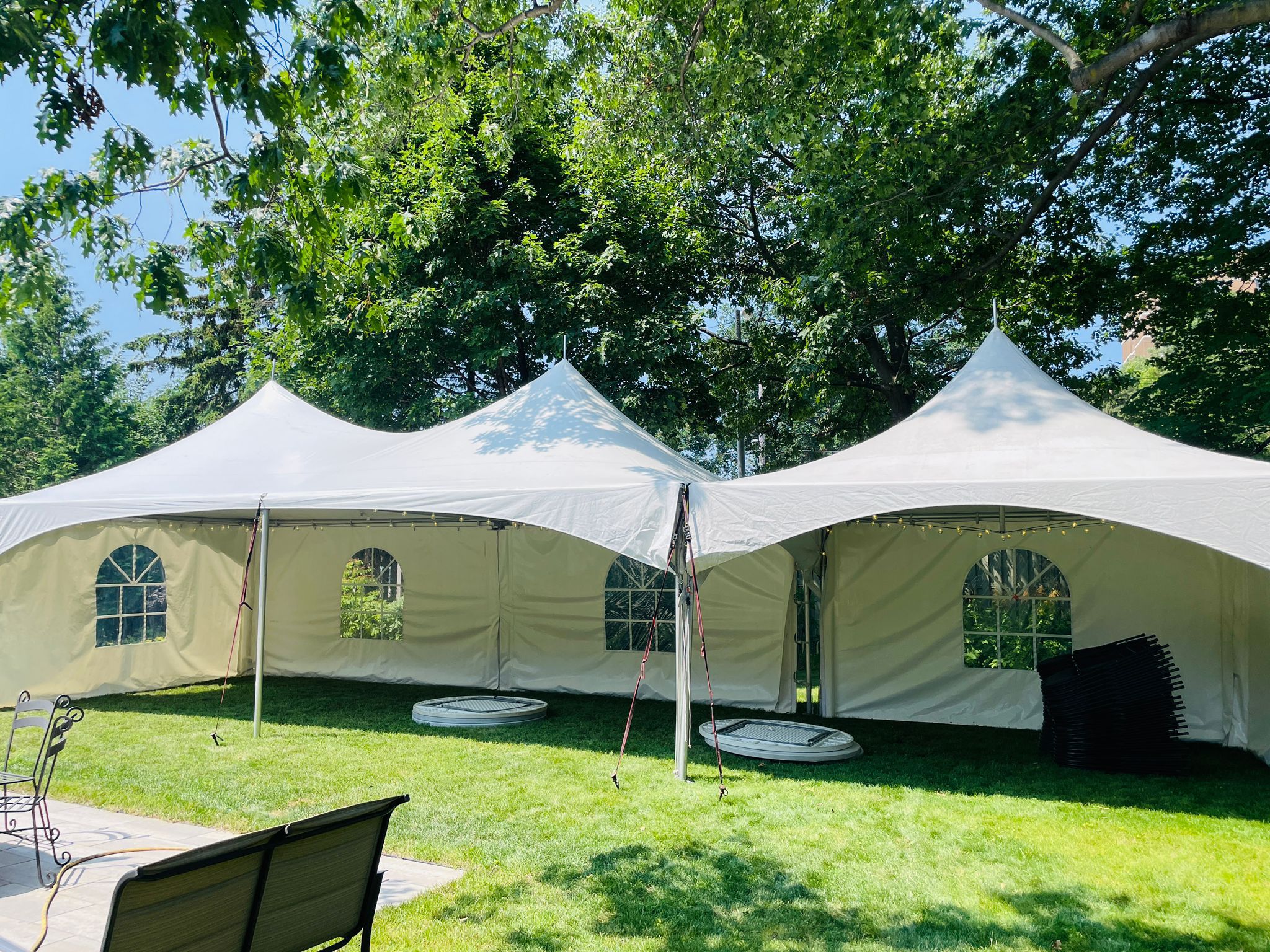 An elegant multi-tent setup with cathedral windows, creating the perfect space for a large backyard wedding or celebration in Oakville 1